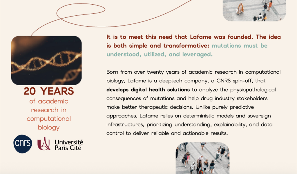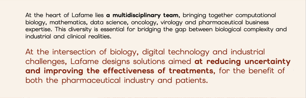 Lafame company, expert in digital prediction, focuses on optimizing therapeutic solutions. Initially, it developed a cutting-edge BigIA technology, combining patient data, Big Data and AI, to minimize therapeutic escape. On the strength of virology results consolidated by several POCs, it created a breakthrough innovation: the first universal digital twin in oncology, enabling personalized therapy.